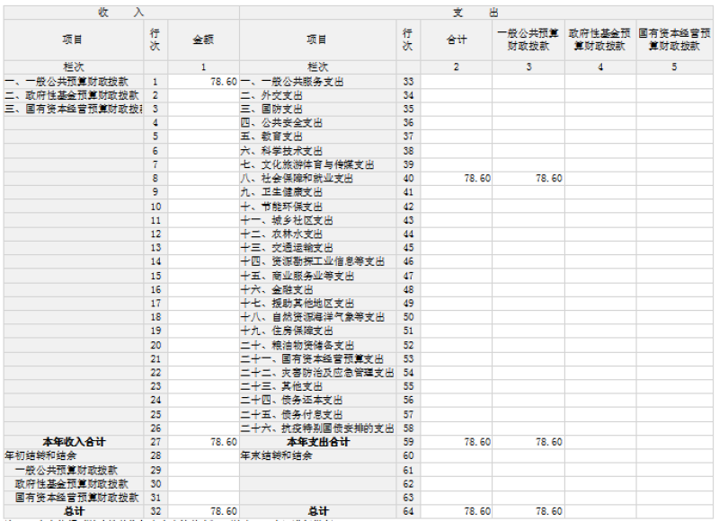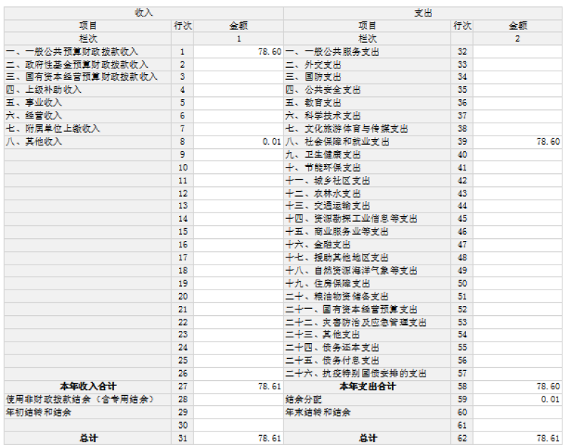 2024年度收、支总计均为78.61万元。与2023年度相比,收、支总计各增加19.39万元,增加32.7%。主要原因:增加人员基本支出。
