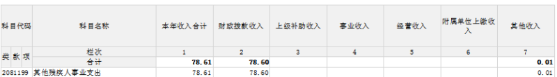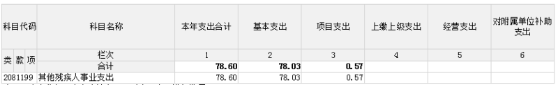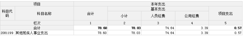 支出合计78.6万元,其中:基本支出78.03万元,比上年增加19.75元,增加33.9%,增加人员基本支出;项目支出0.57万元,比上年0.36元,38.7%,主要当年假肢材料采购减少;上缴上级支出0万元,比上年增加(少)0元,长(降)0%;经营支出0万元,比上年增加(少)0元,长(降)0%;对附属单位补助支出0万元,比上年增加(少)0元,长(降)0%。