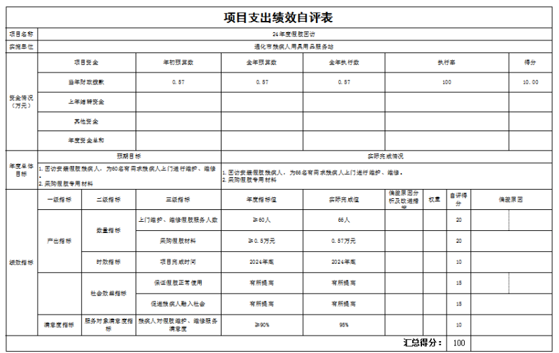 24年度假肢回访项目绩效自评情况:根据年初设定的绩效目标,项目绩效自评得分为100分。项目全年预算数为0.57万元,执行数为0.57万元,完成预算的100%。项目绩效目标完成情况:一是产出指标:上门维护、维修假肢服务66;二是效益指标:保证假肢正常使用、促进残疾人融入社会都有所提高。